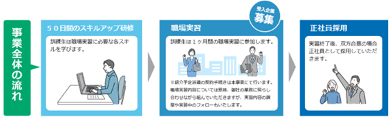 デジタル人材の正社員採用を検討されている企業で、50日間のIT研修を受けた訓練生を職場実習後に正社員採用していただける企業を募集しております。