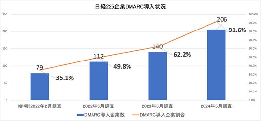 TwoFiveの調査において、日経225企業は、2024年5月時点で、206社(91.6%)が少なくとも1つのドメインでDMARCを導入し、昨年同月(140社 / 62.2%)と比較すると1年間で29.4ポイント増加しました。