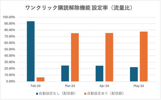 メール送信者向け新ガイドラインでは、商用の宣伝メッセージの場合、ワンクリックでの購読解除(RFC8058 / List-Unsubscribe)に対応する必要があります。エンバーポイントは、今年1月、この条件を自動的に満たして配信できるよう、Mail Publisherに「ワンクリック購読解除機能」を新たに追加しており、1月下旬の提供開始から現在までの約3カ月間で、 全配信数の77.7%が利用しています。