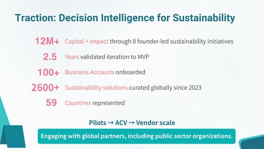 私たちの夢は、世界中のサステナビリティソリューションをつなぎ、企業や組織が「次に何をすべきか」を判断できる、世界最大の意思決定プラットフォームをつくることです。