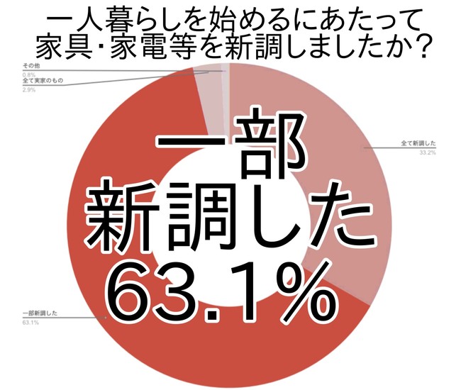 最も多かったのは「一部新調した(63.1%)」という回答でした。実家のもので一人暮らし用に活用できるものは持っていき、それ以外で必要なものを新調する方法です。