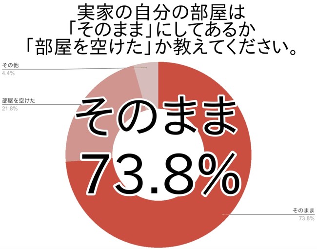 7割以上(73.8%)が実家の自室を引越し後にそのままにしていると答えました。また、約2割(21.8%)は部屋を空けたと答えています。