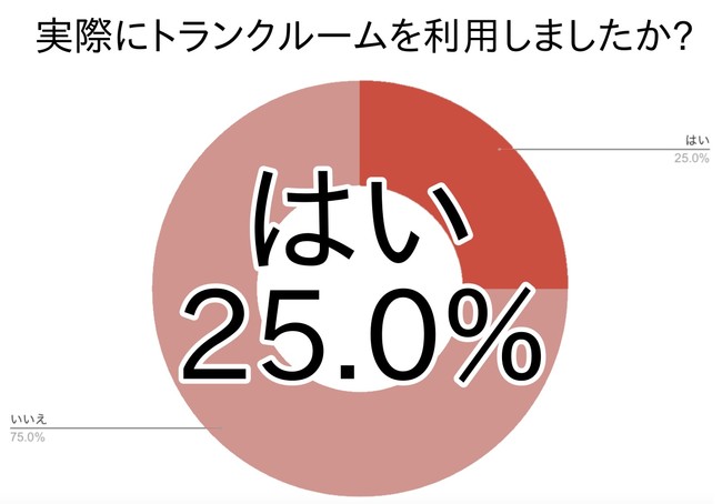 トランクルームを実際に利用した方は25%でした。何かと出費がかさむ時期であることもあり、検討後に断念した方もいるものの、以前から行ってきたアンケートの中では高い割合であり、最近は、実際にトランクルームを利用する方の割合が増えてきています。