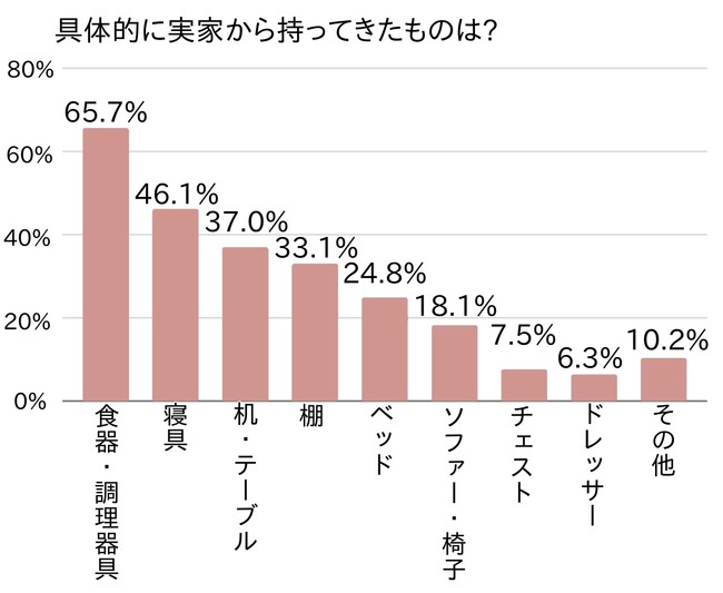 第2位以降は、実家の自室で自分専用として使っていたものを持っていく傾向が浮かび上がりました。具体的には、寝具(46.1%)・机・テーブル(37.0%)・棚(33.1%)・ベッド(24.8%)等がありました。