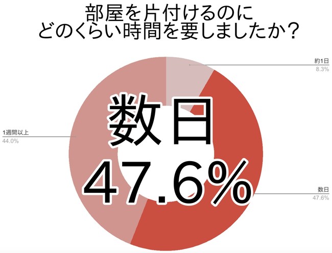 一番多かったのは「数日(47.6%)」で、それに拮抗していたのが「1週間以上(44.0%)」でした。つまり、9割以上が数日以上はかかり、その多くが荷物の整理や取捨選択を伴うものでした。