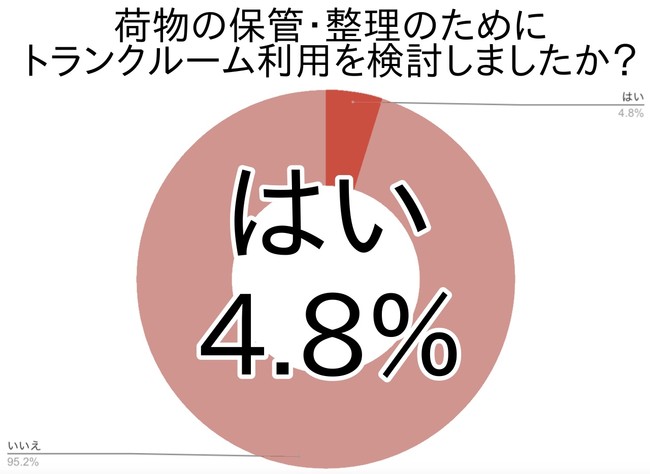 アンケートではトランクルーム利用を検討したのはわずか4.8%でした。やはり、これまで実家に収まっていたものだから家の外で保管するという発想がない、もしくは、ためらいがあることが表れている結果だと言えるでしょう。