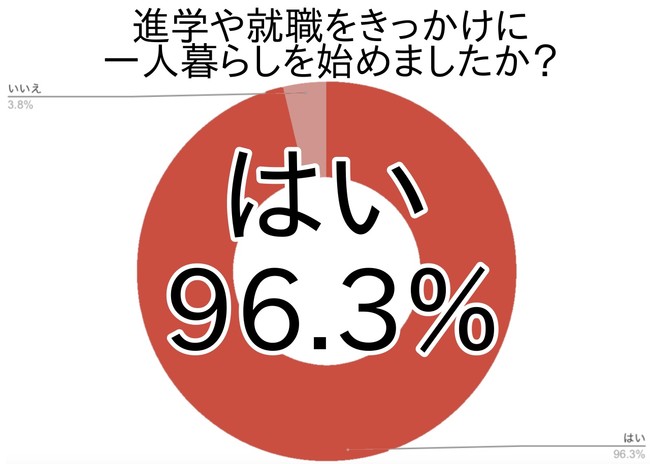 進学・就職を機に一人暮らしになった方は96.3%という結果になりました。ほとんどの方の一人暮らしのきっかけは進学・就職であると言えるようです。