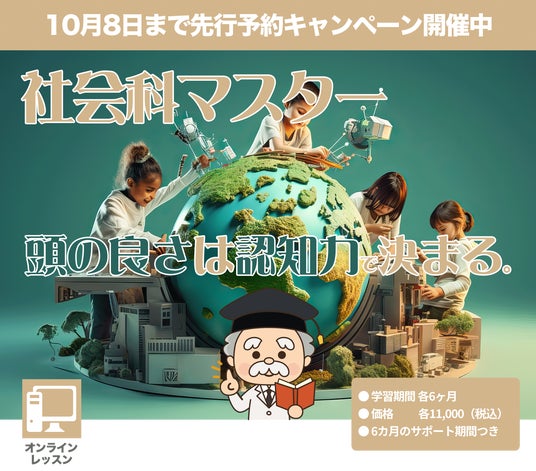英語教材『パルキッズ』シリーズを提供する株式会社児童英語研究所は、10月9日から認知力を上げるオンライン教材『社会科マスター』の提供を開始する。10月8日まで特別価格にて先行予約を受け付けている。