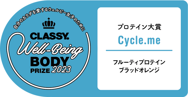 株式会社ドットミー(本社:東京都中央区、代表者:知念孝祥ジョナサン)のウェルビーイングブランド「Cycle.me(以下、サイクルミー)」フルーティプロテイン〈ブラッドオレンジ〉が、光文社『CLASSY.』7月号(5月26日発売)で「CLASSY. Well-Being BODY PRIZE 2023」のDIET部門プロテイン大賞に選ばれました。