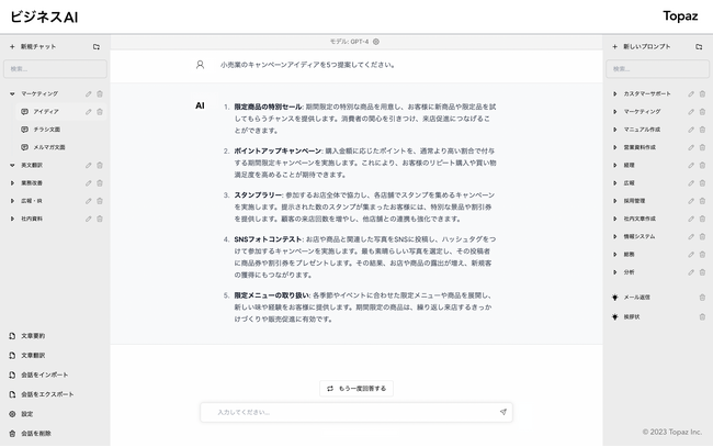 2000社導入のAIプラットフォーム「AIOne」を提供するTopaz合同会社は、GPT-4・ChatGPTが利用可能な法人/ビジネス向け生成AI・AIチャットサービス「ビジネスAI」を2023年5月1日(月)にリリースいたしました。本日よりオンラインでの申込受付を開始いたします。