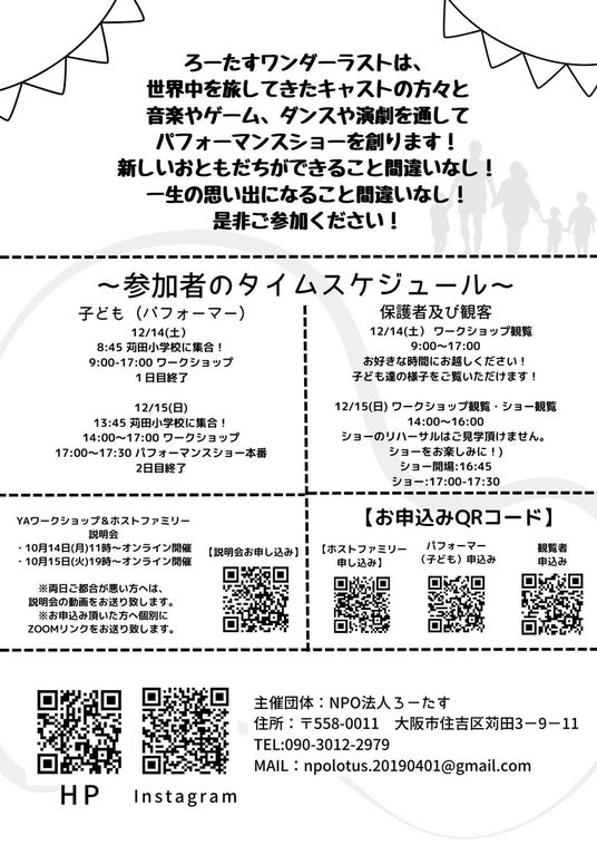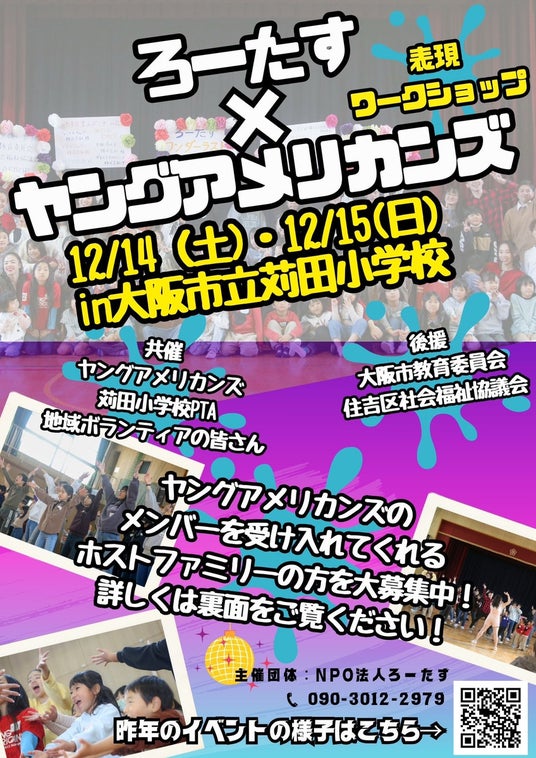 昨年・一昨年と、NPO法人ろーたす(所在地:大阪市住吉区、代表:松下祥貴、以下「ろーたす」)が開催し、児童養護施設・子ども食堂・フリースクールなどから子ども達100人以上が集い大感動を生んだ表現教育ワークショップが、今年は世界的NPO団体ヤングアメリカンズを招聘して今までよりも更にパワーアップして帰ってきます!子ども達が「私って素敵なんだ!」と自己肯定感を育み、希望を持って生きられる力を身に付けるための表現教育のワークショップ。今年は12/14(土)・12/15(日)に大阪市立苅田小学校の講堂で開催されます。