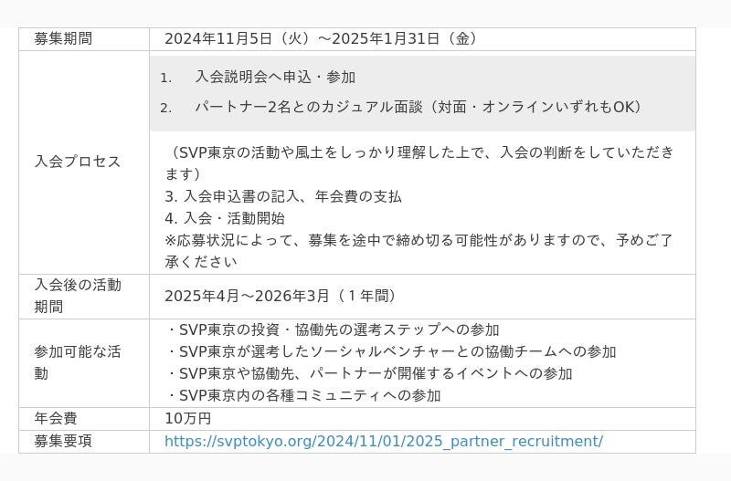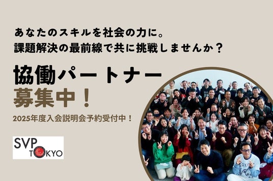 特定非営利活動法人ソーシャルベンチャー・パートナーズ東京(東京都港区、共同代表:神代伸一/瀬川将之/桐ヶ谷昌康/戸田有美、以下「SVP東京」)は、社会的な課題の解決を軸とした革新的な事業に取り組む団体・個人と協働し、ソーシャルインパクトを拡大することを目的にした投資・協働プログラムを2005年から毎年実施しており、今年で21期目を迎えます。この度、SVP東京の投資・協働活動を支えるメンバーである「パートナー」について、新たに募集を開始することをお知らせします。また、2024/12/8(日)~2025/1/18(土)の期間中、4回にわたり、SVP東京の活動やパートナーの役割についてお伝えするオンライン入会説明会を実施します。