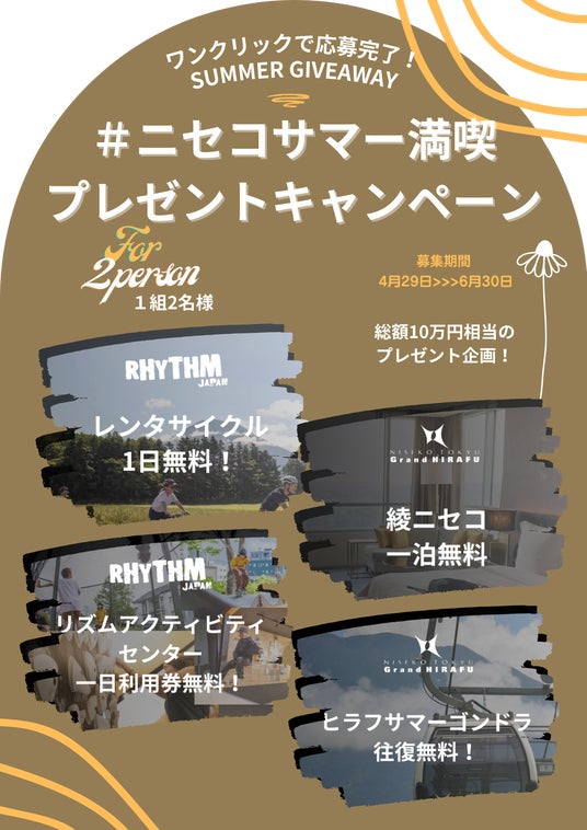 ニセコ東急グラン・ヒラフとリズムジャパンのコラボレーションにより、ニセコ東急グラン・ヒラフのサマーゴンドラのオープンを記念し、総額10万円相当の豪華サマーギフトパックを抽選で2名様にプレゼント。
