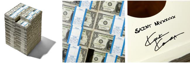 河村康輔の現代的な作風と、(C)SAINT Mxxxxxxの得意とするクラシックな雰囲気が掛け合わされたコラボレーションは、クルーネックスウェットとブランド初となるスツールを展開。シュレッダー・コラージュやその他様々な手法が河村康輔の感性で施された作品となります。1ドル札が積み上げられたユニークなデザインが目を引くスツールは、河村康輔の代表作ともいえるドル紙幣モチーフのグラフィックが落とし込まれ、株式会社ロータリー・ヒロとのコラボレーションにより実現。スツールの裏面には(C)SAINT Mxxxxxxと河村康輔のロゴが入ったスペシャルなアイテムとなっております。