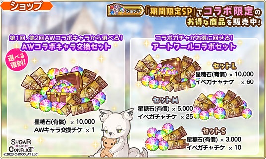 星糖石とコラボガチャが引けるチケットがセットになったお得な商品をはじめ、第1回、第2回コラボ時のキャラクターを交換できるチケットが手に入る商品を販売!