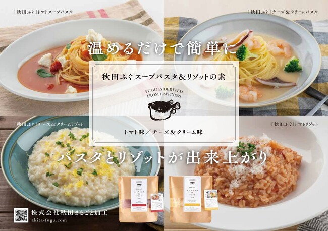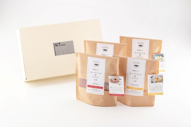 秋田で捕れる「北限の天然ふぐ」を4種類ブレンドして出汁をとり、スープパスタとリゾットの素に仕上げました。自宅で簡単に秋田県産天然ふぐの旨味をお楽しみいただけます。