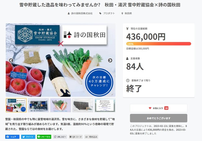 詩の国秋田が地域の事業者とコラボしクラウドファンディングに挑戦する新企画。第一弾として「秋田・湯沢 雪中貯蔵協会」の取り組みを紹介したクラウドファンディングが、3月3日終了し、目標の145%を達成しました。