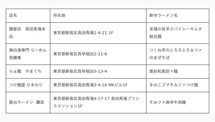 期間中は、ラーメンの名店5軒(麺屋宗、鶏白湯専門 らーめん 我羅奢、らぁ麺 やまぐち、つけ麺屋 ひまわり、屋台ラーメン 鷹流)が、「発酵そみファ」を使用した新時代の「発酵系ラーメン」を提供します。同時にスタンプラリーを実施し、制覇した方にはオリジナルシールをプレゼント。また、鷹流店主が店舗展開する台湾の店舗でも限定ラーメンを提供します。(ラーメンの提供のみ)