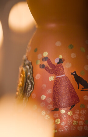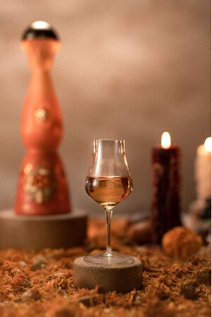 デキャンタは「センパスチル(マリーゴールド)」の花をインスピレーションに、美しいマリーゴールド色の釉薬がデキャンタを覆い、底に近づくにつれて色が濃くなっていきます。裏面には、メキシコ人アーティストのヒメナ・エスティバリスによる、センパスチルの収穫をイメージしたイラスト描かれています。仮面をかぶった人々が地面から花を集め、空から降ってくる花を夢中になって腕を伸ばして掴もうとしている様子、そして彼らの側には、古代メキシコから、あの世に向かう死者の魂に付き添う案内役として信じられているショロ犬が描かれています。また、正面にはメキシコのミラグロス・デ・ラトン工房の職人が2週間かけて手作業で仕上げた24金のメダルが施されています。