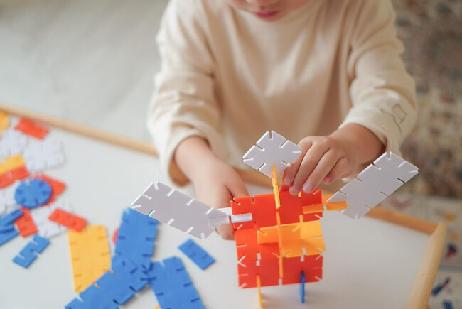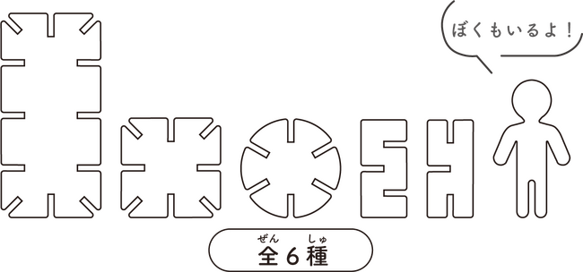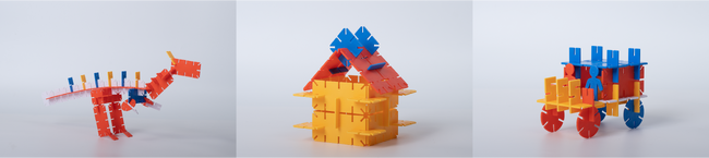 溝(スリット)の入った6種類のパーツを組み合わせることで、平面から立体に自由自在に創造する組み立てブロック。挿し込む向きや角度を試行錯誤して、家や乗り物、生き物まで創り出すことができます。「平面パーツ」「種類は6種類のみ」という程よい制約により、何を・どのように組み立てるのかを考える発想力や思考力が問われる試行錯誤に特化したおもちゃです。