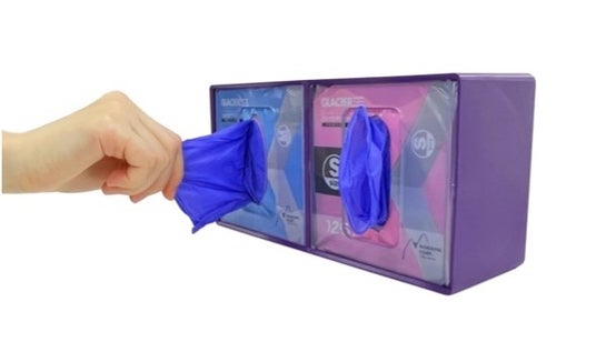 取り出す時はカフ部を引っぱるだけ。素早く確実に1枚ずつ取り出せるニトリルグローブは、取り出しすぎることがないため指先部の汚染を避け、清潔な状態で使用できます。また、従来の箱タイプと比べて約50%コンパクトなパッケージ。専用のディスペンサーを併用することで、壁面に設置ができより素早い装着が可能となります。