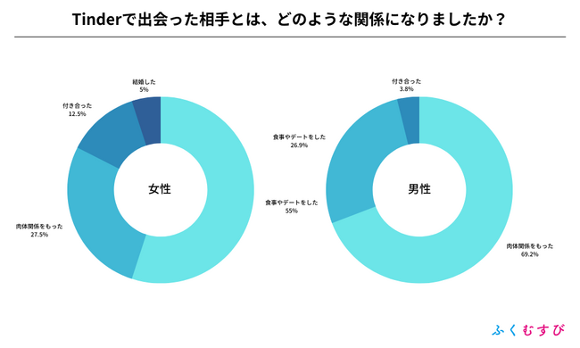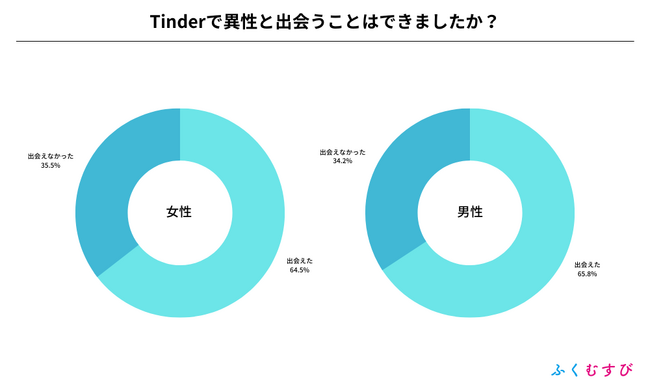 ・Tinderで異性と出会えた割合は、男性が65.8%、女性が64.5%となりました。