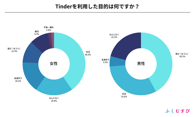 ・男性がTinderを利用した目的は、遊びが1位、恋活が2位となりました。