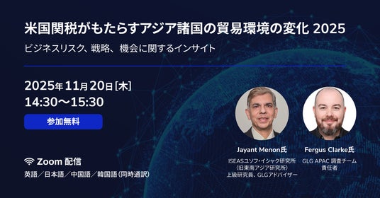 グローバル・インサイト・ネットワークである、株式会社 Gerson Lehrman Group (以下、GLG、本社所在地:東京都港区、代表取締役社長:橋本勇人) は「米国関税がもたらすアジア諸国の貿易環境の変化 2025」をテーマにした無料ウェビナーを、11月20日(木)14時30分に開催いたします。
