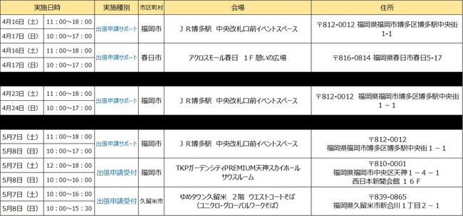 ※開催場所の調整状況や新型コロナウィルスの感染状況等により、「出張申請受付」及び「出張申請サポート」の開催を中止・延期、または実施内容が変更となる可能性がございます。