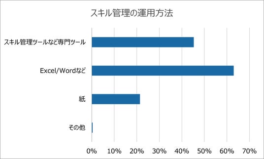 スキル管理を実施していると回答した方にその運用法について聞いたところ、「Excel/Wordなど」が63.0%、「スキル管理ツールなど専門ツール」が45.3%、「紙での運用」が21.4%、「その他」が0.4%という結果になりました。