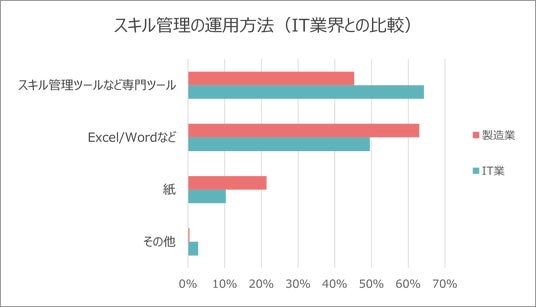 IT業界と比較すると、「ExcelやWordなど」でスキル管理を実施している製造業の企業の割合は約13%高いという結果になりました。