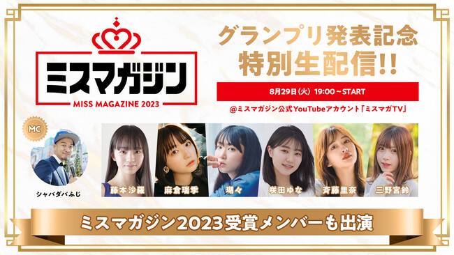 本LIVE配信では、「ミスマガ放課後RADIO!」のラジオパーソナリティを務めるシャバダバふじをMCに迎え、昨年のミスマガジン2022受賞者である瑚々・咲田ゆな・麻倉瑞季・斉藤里奈・三野宮鈴・藤本沙羅の6名がゲストに登場。「ミスマガジン2023」メンバーと初共演になります。