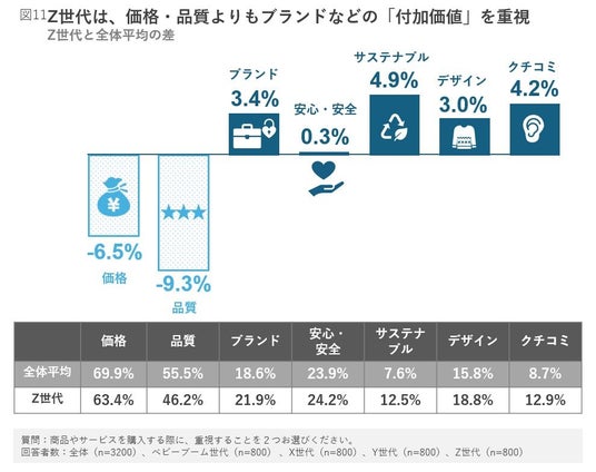 購買の決定においても、世代間の違いは明らかで、ベビーブーム世代とX世代は、全てのカテゴリーで、価格と品質を重視しているが、Y世代とZ世代は、それらの世代よりも価格感度は低く、ブランドやデザインなど付加価値を評価する傾向にある。特にZ世代は、ブランドやサステナビリティ、デザイン、周りからの評判を重視する傾向が強い(図11)。