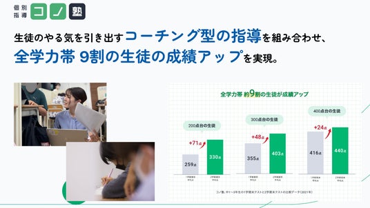 コノ塾では「人とリアルな場、デジタルテクノロジー」を融合させることで、生徒一人ひとりが成功体験を持てる教育を提供し、全ての学力帯の生徒での成績アップを実現しています。2020年12月にオープンした「コノ塾」は、多数の都立高校合格の実績なども支持され、生徒数も順調に増加しています。