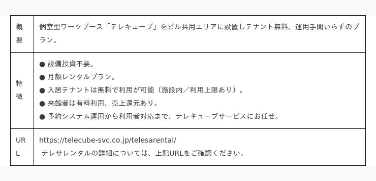 今回、このようなビル運営の課題を踏まえ、テレキューブをビルの共用設備として、ビル共用エリアの有休スペースにレンタル設置するプラン「テレサレンタル」の提供を開始しました。これにより、ビルオーナーは「設備投資ゼロ、月額レンタル制」かつ「テナント無料提供」で、ビル共用エリアにWeb会議対応の個室ワークブースを整備していただくことが可能となります。