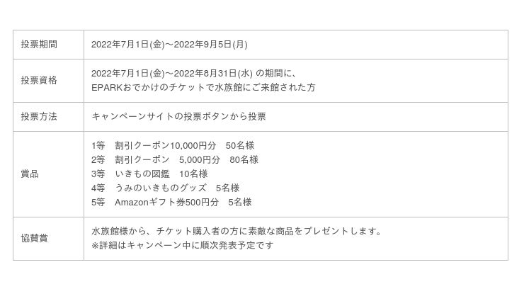 株式会社EPARKフィナンシャルパートナーズ(本社:東京都豊島区、代表取締役社長:津田 卓明)が運営する、スマートフォン1つでレジャー施設の電子チケットをおトクに事前購入できるサービス「EPARKおでかけ」(https://ticket.mamakoe.jp/)は、『うみのいきもの総選挙2022』の水族館協賛賞の賞品を、水族館スタッフ様の応援コメントのご紹介とともに、特設サイトで発表いたします。