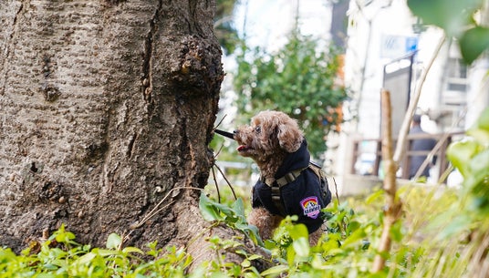 お散歩中に、公園の草むらで遊んだり、道端の植え込みで匂いを嗅いだり。