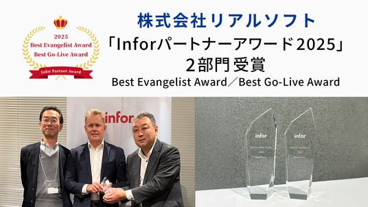 株式会社リアルソフト(本社:神奈川県横浜市、代表取締役:板崎裕)は、インフォアジャパン株式会社主催の「Inforパートナーフォーラム2025」において開催されたパートナーアワードにて、「Best Evangelist Award」および「Best Go-Live Award」の2部門を受賞したことをお知らせいたします。