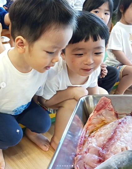 うれしい保育園で特徴的なのが、命を頂いていることを体感する食育です。園児の前でぶりを一匹丸ごとさばくイベントでは、普段食卓に並ぶ魚がどのようにして食べ物になるのかを目の前で学びます。