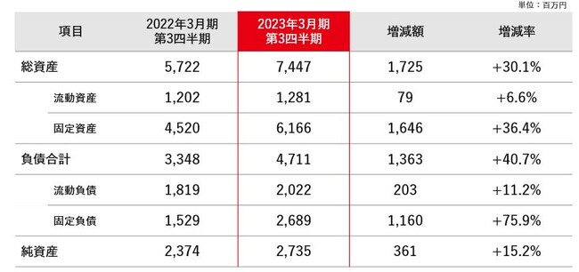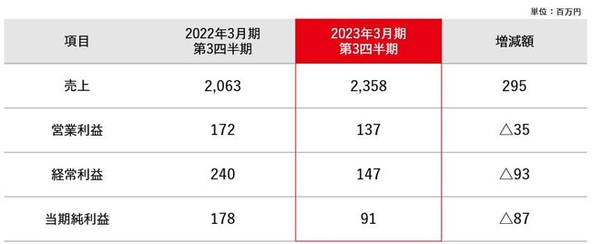 ※2022年10月に子会社のベトナム現地法人を設立したため、2023年3月期第3四半期より連結決算、2022年は単体決算となっておりますので、増減額は参考値としております。