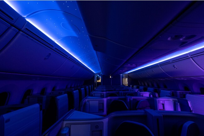 787型機のカーボンファイバーコンポジットの機体は、客室高度を低く保つと同時に空気のろ過を高めることを可能にし、より快適なフライトをもたらします。また、吸音処理されたエンジン吸気口による静かなキャビン、超大型の調光可能な窓、広々とした頭上手荷物収納棚、タッチレス水栓を備えた化粧室を装備しています。