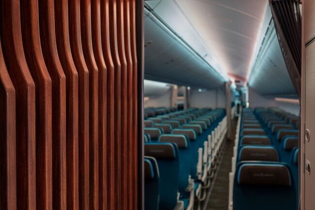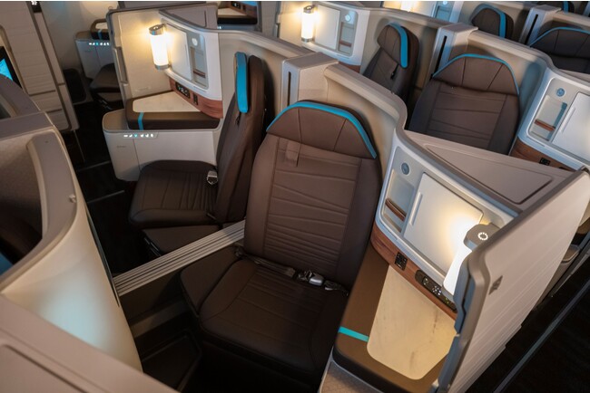 787型機のメインキャビン(エコノミークラスおよびエクストラ・コンフォート)には、人間工学に基づいた背もたれおよびアームレストを搭載したコリンズ・エアロスペース社のアスパイヤシートを266席配置し、シート面積を最大化させ背面と座面にゆとりを持たせており、軽量で近代的なデザインになっています。また、12インチのシートバックモニターとUSB-A およびUSB-C充電ポートも装備しています。