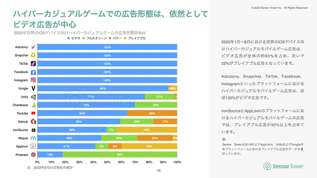 ビデオ広告はハイパーカジュアルモバイルゲーム広告全体の約60%を占め、22%を占めるプレイアブル広告は主にironSourceとAppLovinに出稿されています。