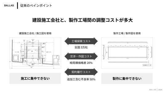 * 図面バラシ:建設工事会社と製作工場とで製作する部材の仕様確認を行い、詳細図面を作成する設計工程です。建設現場では一品一様の部材が用いられることが多く、この「図面バラシ」は都度発生する工程です。一方で、暗黙知が多く、建設工事会社と製作工場間の情報の非対称性により取引コストに影響を与えるため、サプライチェーンのボトルネックになっています。
