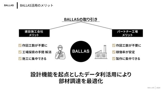 また、建設工事会社様は、BALLASのパートナー工場ネットワークを活用でき、素材・加工仕様に合わせた最適な工場で部材を製作することができます。これにより、工場探しの工数が解消し、QCDの改善を享受できます。
