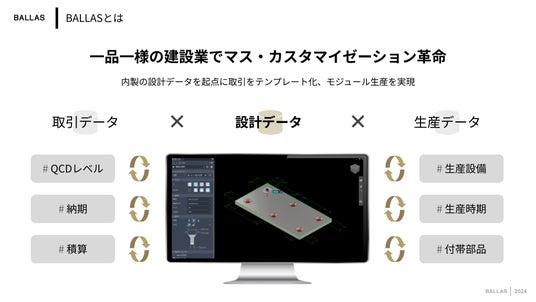 BALLAS は、建設工事会社様が建設物の一部として使用する建設部材の設計から納品までを担うファブレスメーカーです。特に業界用語で「製作金物」と呼ばれる特注の金属部材に強みを持ち、データの利活用、部材のモジュール化により、喫緊の業界課題であるサプライチェーンの最適化に取り組んでいます。