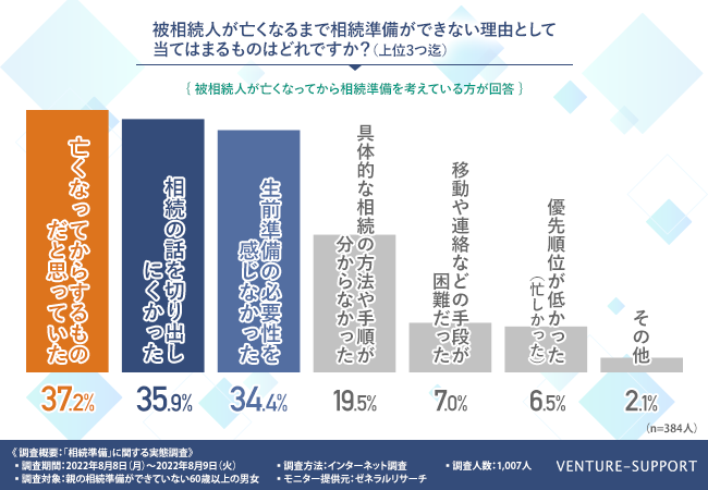 被相続人が亡くなってから相続準備を考えていると回答した人に、「被相続人が亡くなるまで相続準備ができない理由として当てはまるものはどれですか?(上位3つ迄)」と質問したところ、「亡くなってからするものだと思っていた(37.2%)」が3割強で最多、「相続の話を切り出しにくかった(35.9%)」「生前準備の必要性を感じなかった(34.4%)」と続く結果となった。