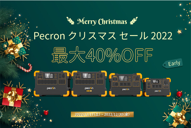 2012年に設立した営業・開発・製造が三位一体となり、世界各地のお客様のニーズに応え、安全で高品質なポータブル電源とソーラーパネルの開発を目指して先端技術会社Pecron Trading (HK) Co., Limited【ペクロン,所在地:香港、代表取締役 史為新、以下「Pecron」】は、2022年12月17日(土)から12月30日(金)までの期間、Pecron公式オンラインストアおよびAmazon店にてPecronポータブル電源とソーラーパネルの全シリーズ製品が最大40%OFFになるクリスマス先行セールを開催します。ぜひお見逃しなく!