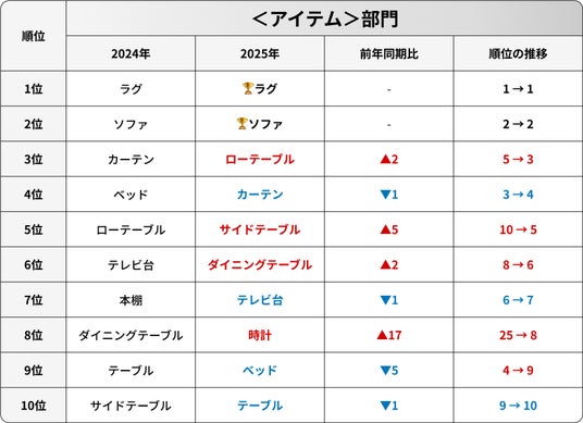 <アイテム部門>「ラグ」「ソファ」がトップ維持、「テーブル」ニーズが細分化