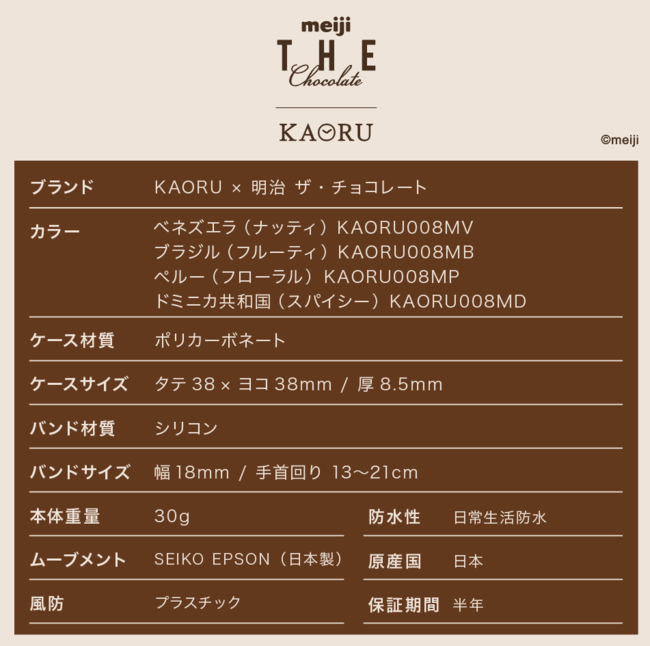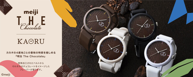 五感で愉しむ「明治 THE Chocolate」と香りに包まれる腕時計ブランド「KAORU」のアイディアを詰め込んだ「大人が愉しむ香り」をテーマにしたコラボレーションウォッチを展開します。https://kaoru.watch/meijithechocolate/